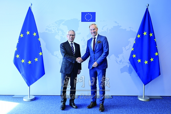 【本報消息】新聞局訊:行政長官岑浩輝於當地時間二十四日下午,在布魯塞爾與歐盟對外行動署副秘書長奧洛夫 · 斯庫格(Olof Skoog)會面,雙方就進一步鞏固和拓展經貿合作伙伴關係、協同發展高新科技產業等議題交流意見。