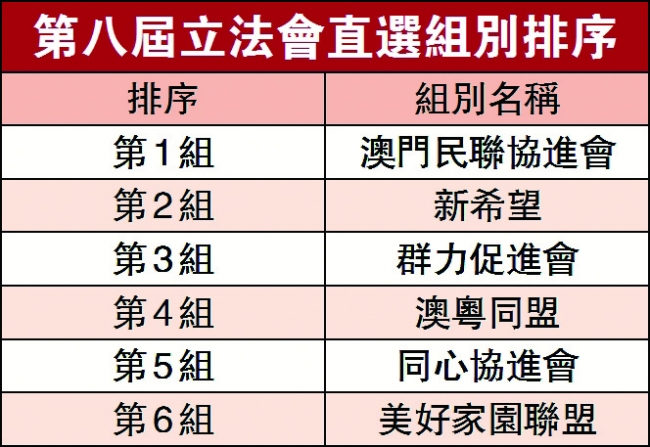 【本報消息】立法會選舉管理委員會昨日上午十一時四十分在公共行政大樓地庫演講廳抽籤,以確定六組直選組別及兩組間選組別在第八屆立法會選舉選票上的排序。