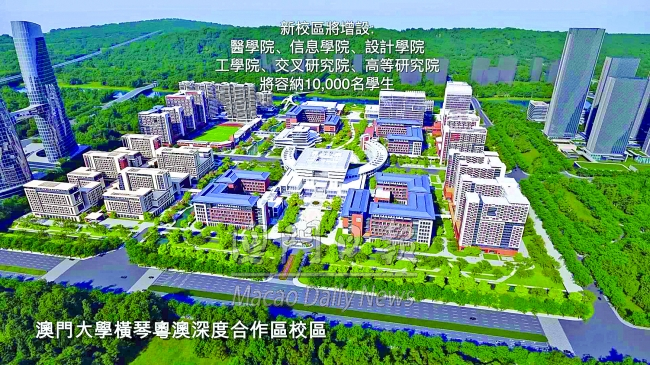 澳門大學網站顯示,澳大深合區校區位於橫琴粵澳深度合作區西南部,項目出讓總用地面積約三十七點五六萬平方米,建築面積約八十三點一萬平方米,將增設醫學院、信息學院、設計學院、工學院、交叉研究院及高等研究院,預計可容納一萬名學生,計劃於二○二八年八月投入使用。