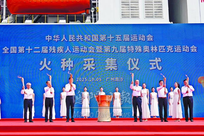 【本報消息】第十五屆全國運動會、全國第十二屆殘疾人運動會暨第九屆特殊奧林匹克運動會火種採集儀式,昨日上午十時在廣州南沙科考碼頭“夢想”號大洋鑽探船旁舉行。火種採集完成後,將於下月在香港、澳門、廣州及深圳四地舉行火炬傳遞活動。