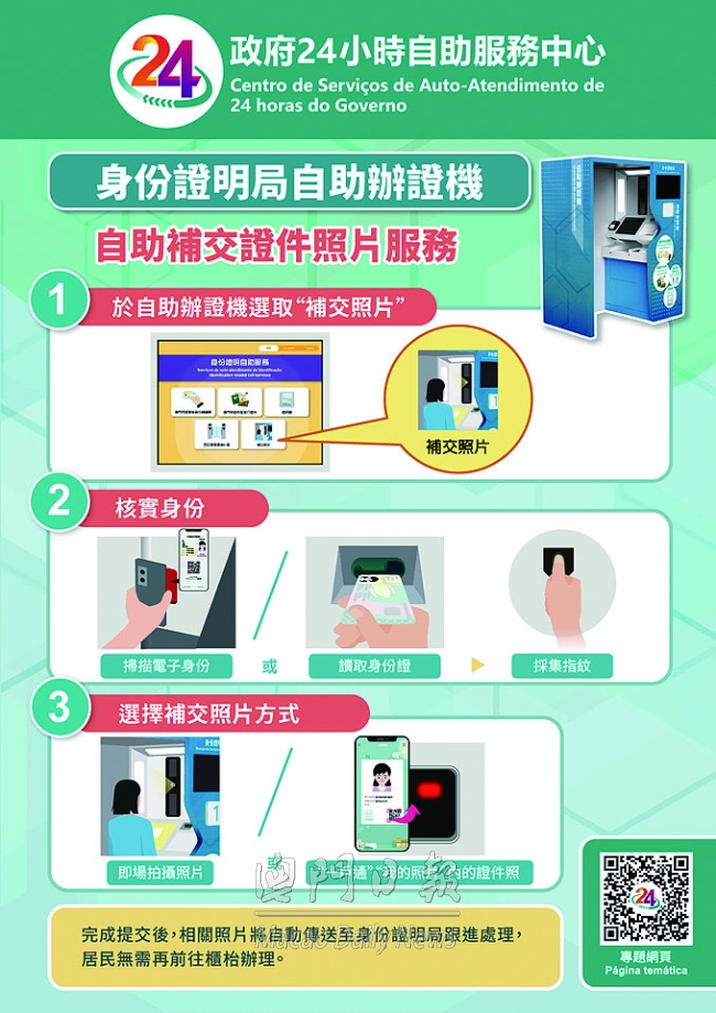 為簡化居民補交證件照片的手續,即日起,收到補交照片通知的澳門特區居民身份證、澳門特區旅行證件及往港旅遊證的申請人,可前往澳門八個政府二十四小時自助服務中心,以及橫琴政務服務中心二十四小時自助服務區和“澳門新街坊”澳門政務二十四小時自助服務中心,使用澳門政府的自助辦證機完成補交手續。申請人只需選擇“補交相片”服務項,透過實體身份證或電子身份,以及指紋核實身份後,便可選擇使用在自助辦證機即場拍攝的照片,或“一戶通”“我的照片”內的證件照作為補交照片。完成提交後,相關照片將自動傳送至身份證明局跟進處理,居民無需再前往櫃檯辦理。